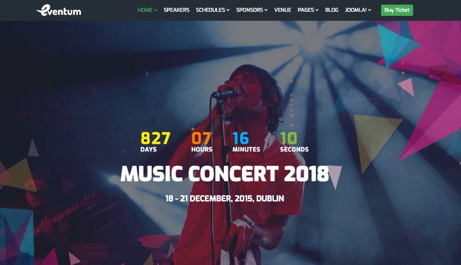 This Eventum home variation sports a conspicuous hero section having a left-aligned countdown timer followed by a ticket selling area, event schedules, ticket pricing, maps and other featured elements. The sponsor list is right above the map to make it more visible to the visitors’ eye. This home variation has a newsletter section as a plus. Here is a screenshot.