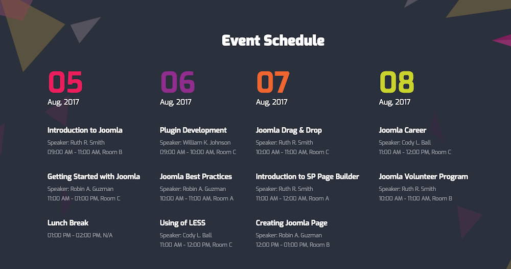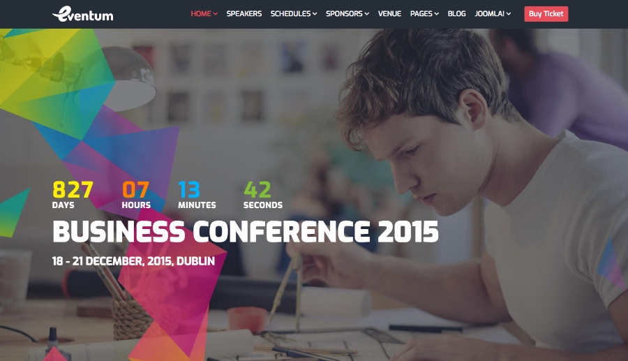This home variation starts with a stunning hero section that shows a delightful countdown timer. The ticket buying call-to-action is right next to the intro video, which drives the users to buy ticket immediately. Then to represent the details of the event, the event schedule section comes. This section is followed by speakers list, ticket pricing, and sponsor list. Check the screenshot below.