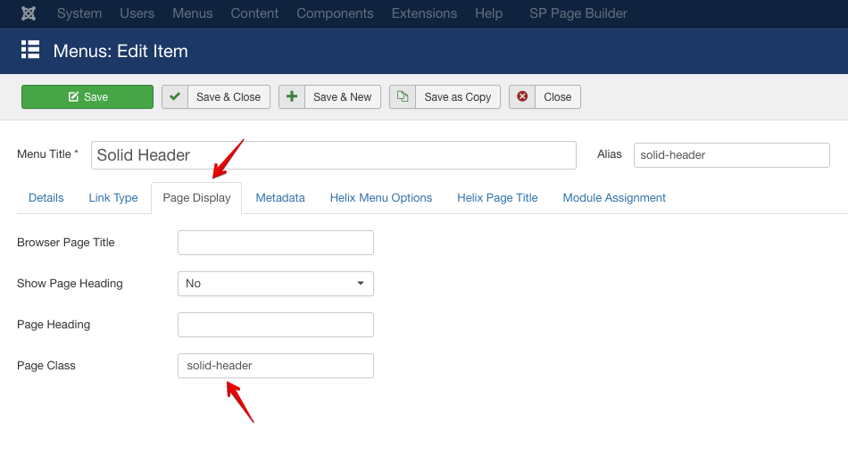 To get the solid header design from the beginning, go to your Joomla backend > Menus. Open the Page Display tab in the editing mode, and put 'solid-header' inside the Page Class field. Save changes, and it's done!