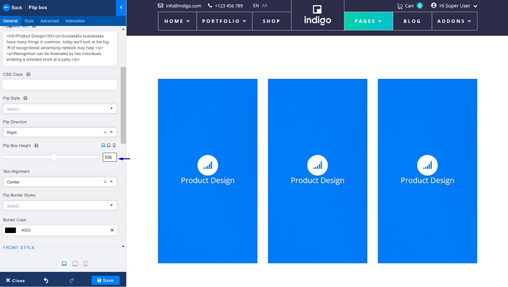 Step 2: The Flip Box addon lets you change the height of the box to adjust text length or images accordingly. Change the flip boxes’ height to the length that looks the best with your existing layout.