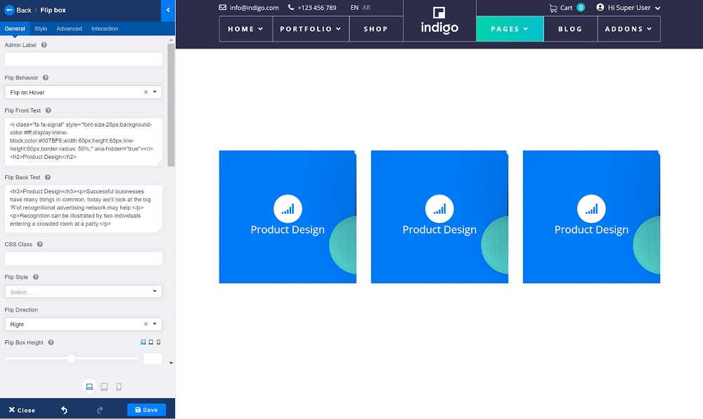 Step 5: Customize the flip-style and behavior. You can set the flip behavior to flip on hover or click. This addon gives you the flexibility to choose your flip style from the rotate, slide, fade, and 3D.