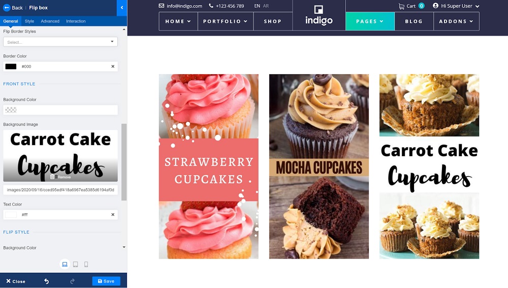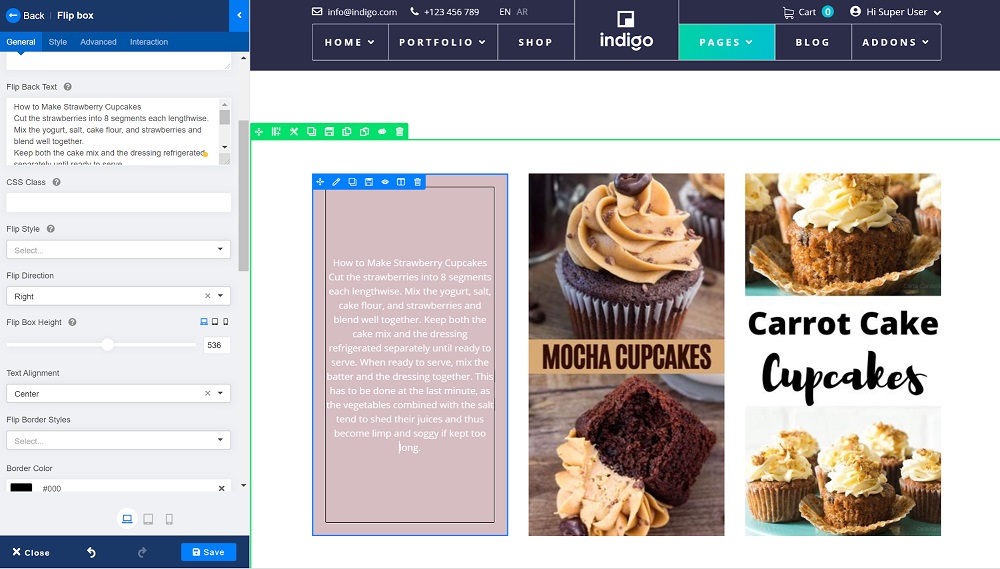 Step 4: Time to add our text content. SP Page Builder's Flip Box addon has fully customizable content on the front and the backside. You can set title, add descriptions, or use buttons on your content, and more. How about we add the recipes for our cupcakes behind each image?