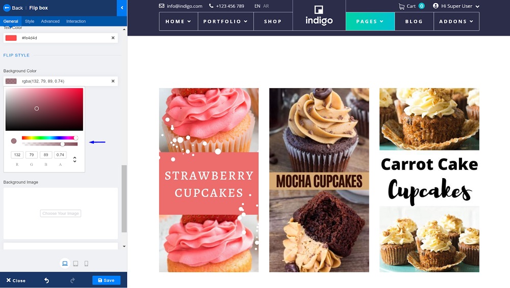 Step 5: Set your background color. The SP Page Builder Flip Box addon allows you to customize the color of the backgrounds, title text, body text, and borders. You can set colors and opacity from the settings panel on the left. Easily take control of your colors that go well with your entire page design.