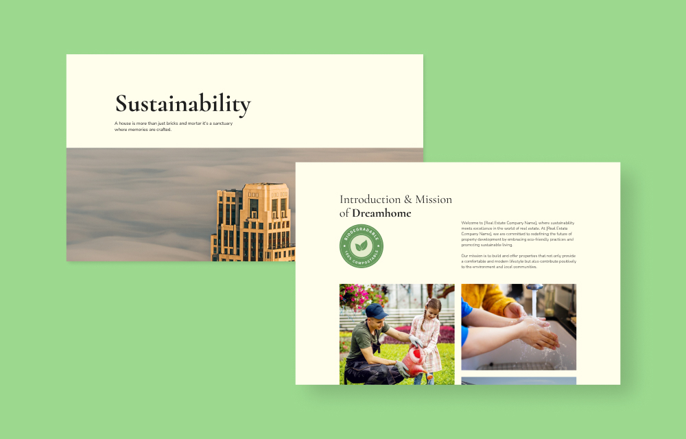 Highlight your sustainability steps with an eye-catching hero section followed by abundant space for images and descriptions of how your small efforts made big differences.