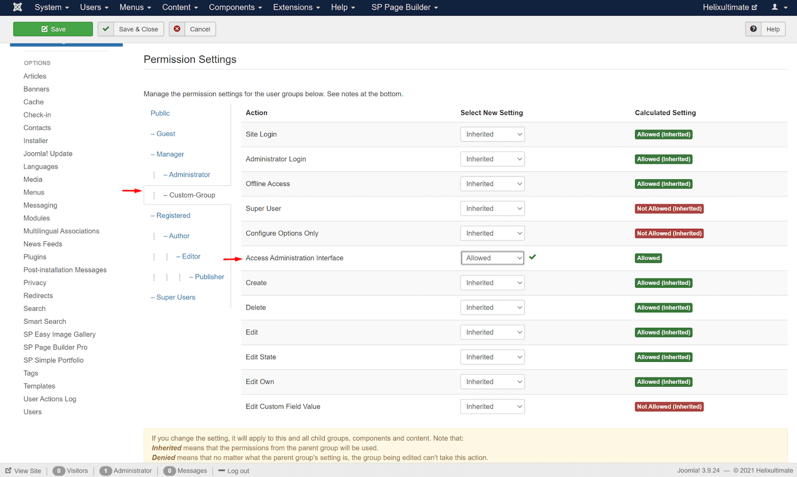 For this tutorial, go to the newly created user group “Custom Group” > “Access Administration Interface” and set it to “Allowed”.