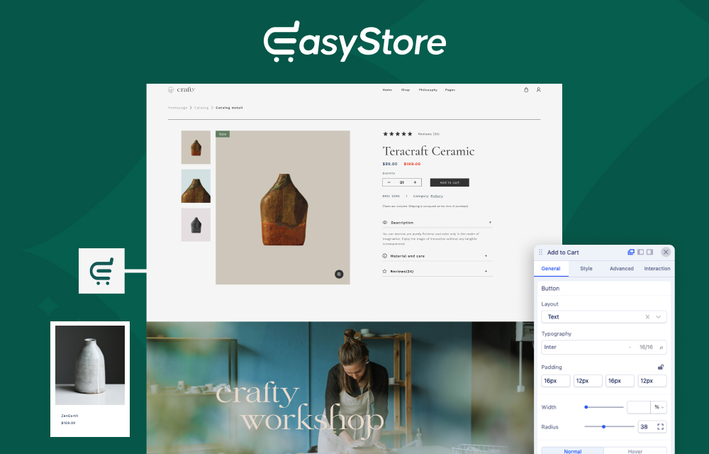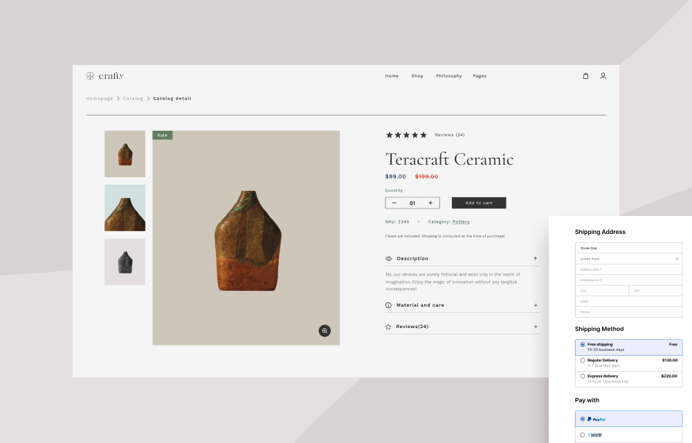 Crafty makes sure your product page is clean and tidy, giving you plenty of room to share all the great details about your creations. You can spice it up with lots of images to give your visitors a good look.