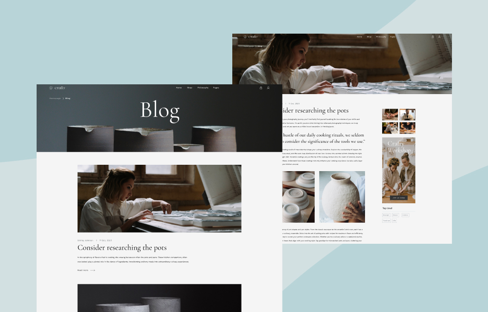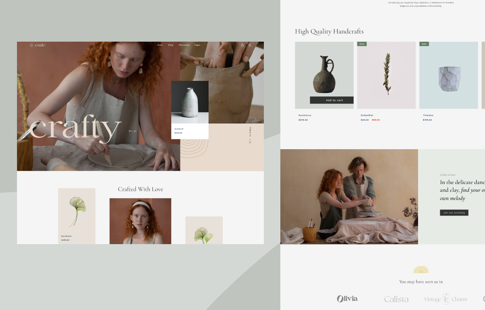 Crafty comes with a visually soothing homepage with a sense of serenity. The gentle yet calming color palette and layout are poised to captivate your visitors and leave an ever-lasting impression.