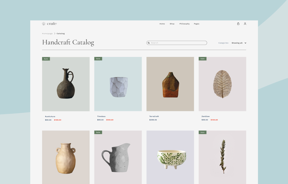 Highlight your products with a dash of sophistication with Crafty’s Product list page. The page comes with every element needed to make your shop page stand out among your crowd.