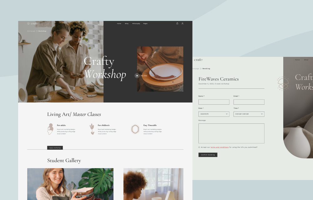 Easily manage your artistic workshops using Crafty's Workshop and Booking Pages. Announce, schedule, and simplify reservations with the dedicated pages. Highlight workshop details on a dedicated page, boost credibility with testimonials on an auto-slider, and streamline bookings with a user-friendly form.