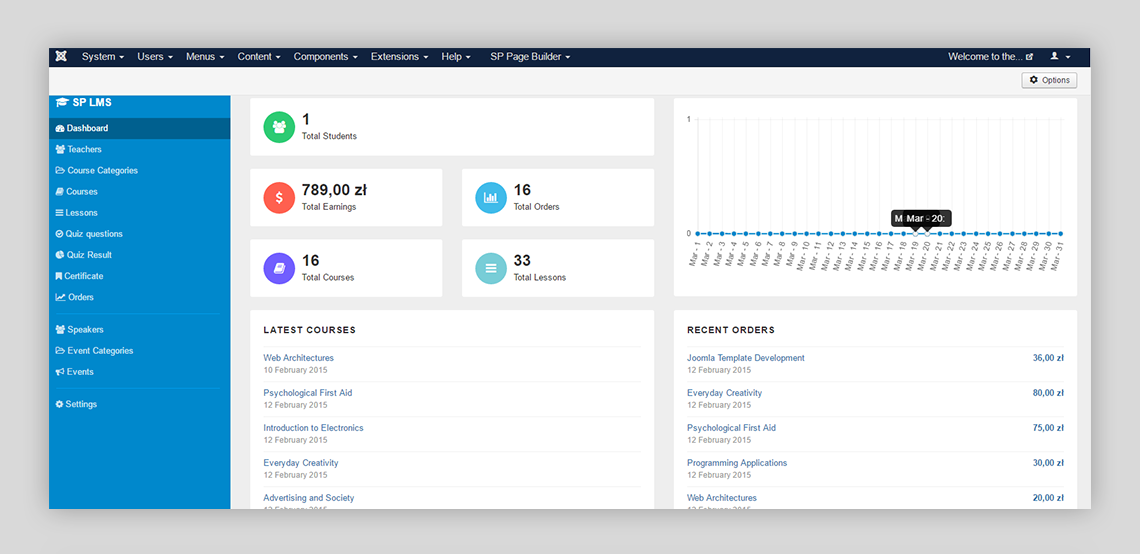 The SP LMS is a full-featured Joomla component with well developed interactive dashboard, course management, teacher management, quizzes & certification options, events organizing, purchase order and so on. Let’s have a look at detailed descriptions about them.