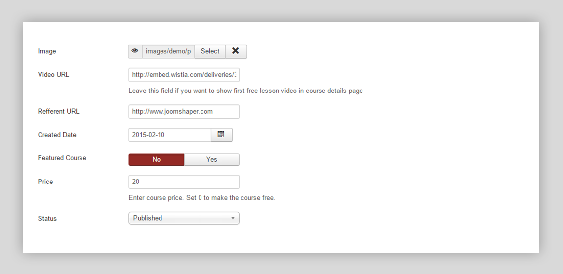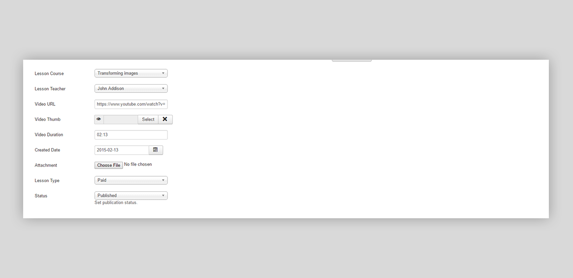 - Add an image and a video URL. Leave the URL field blank if you want to add the videos in the lessons.