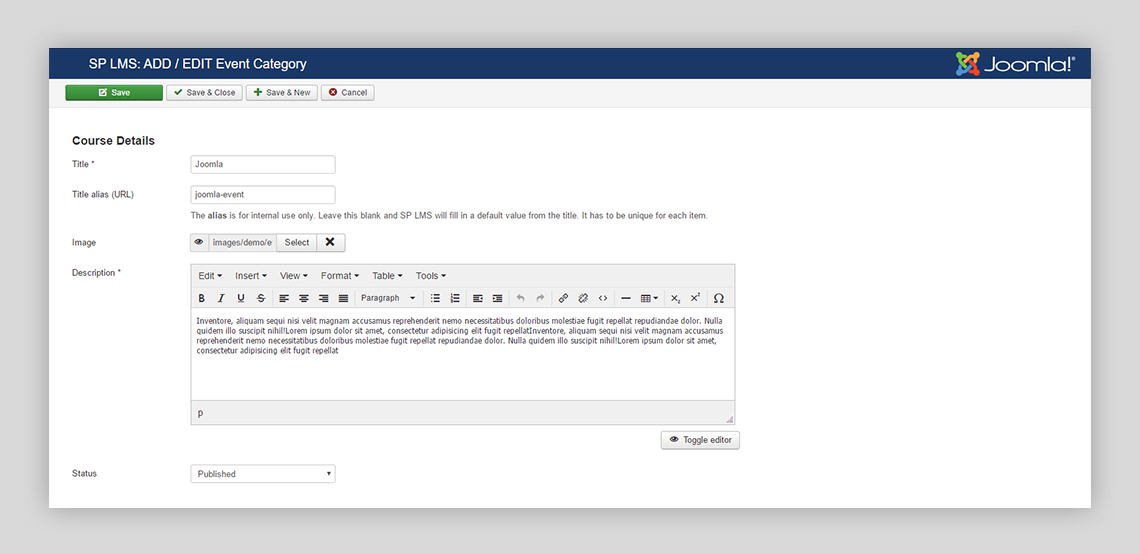 Open the event category from the dashboard and click new to add new event category. Here add all the necessary information regarding the event category. You have to give a new title of your event category, Upload the image of your event category, then add a description regarding all the information of the event category, set the status to published and your event category is ready to roll.
