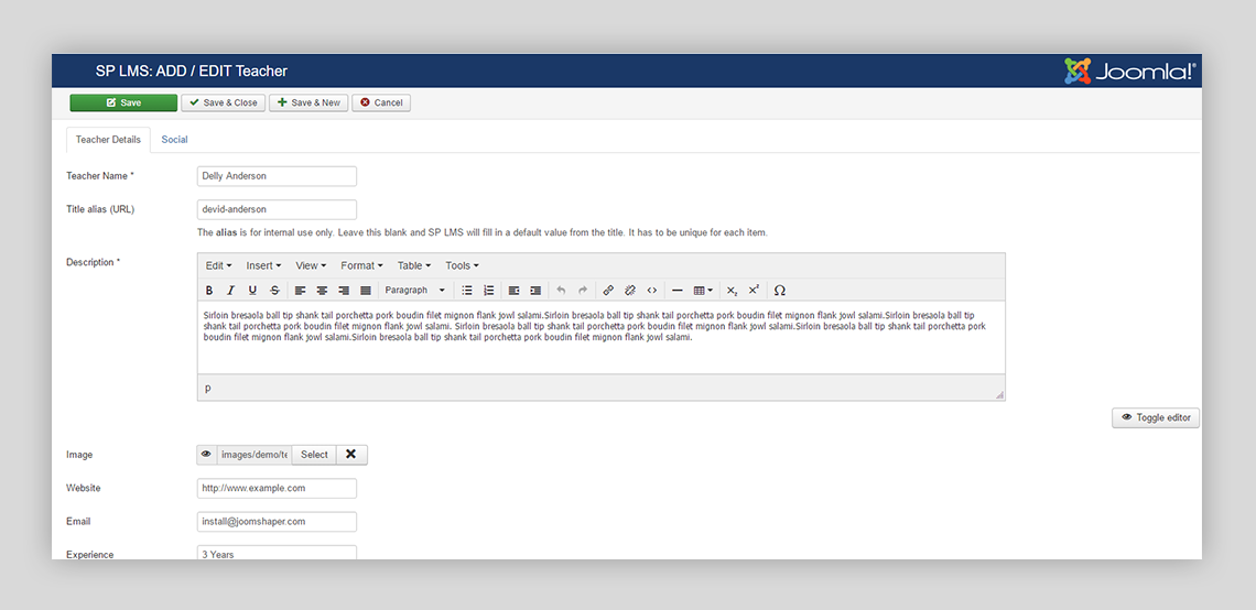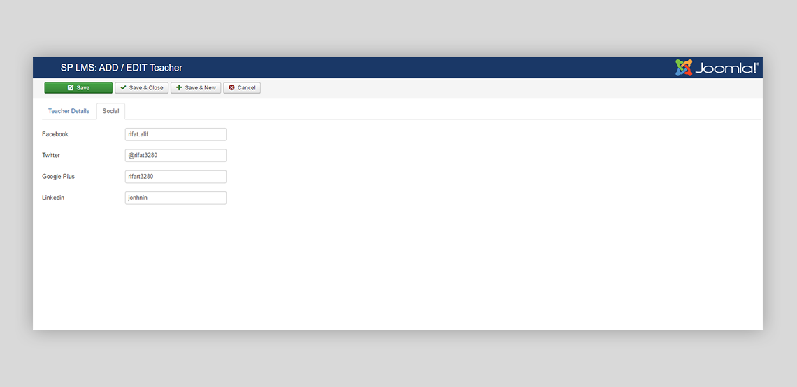 The SP LMS teacher page contains the teacher details and social media connectivity options. You can add new teacher here with all the relevant information. Follow the below steps for adding a new teacher.