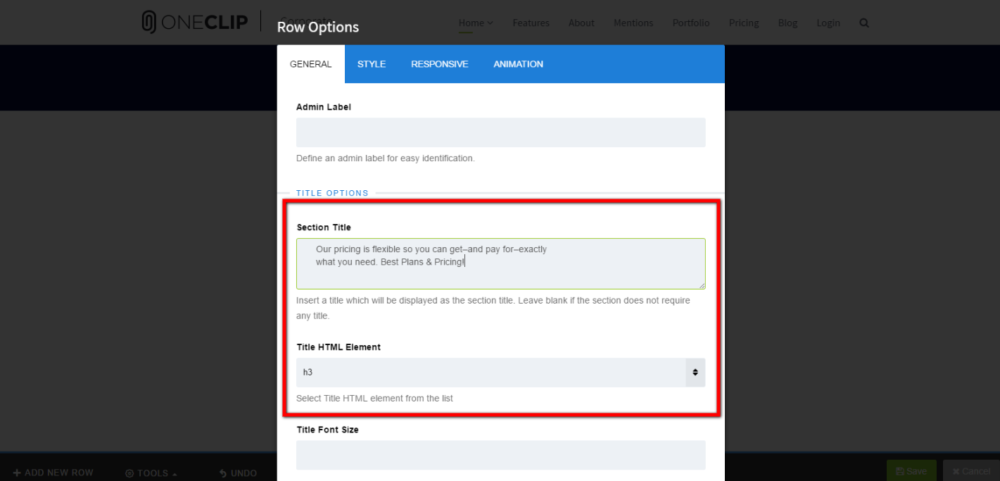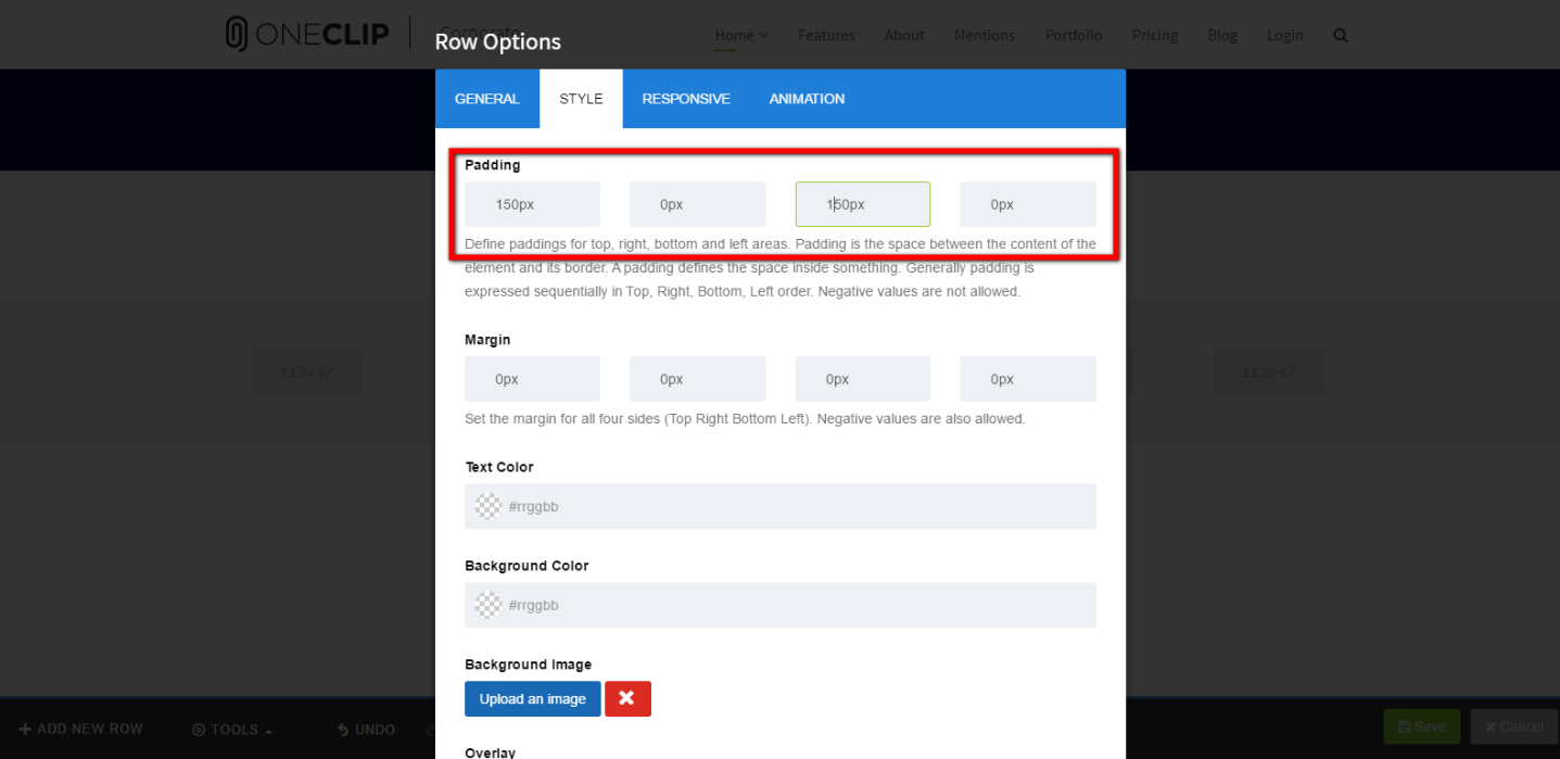 Now open the frontend editor and click Row Option on the newly added row. Options are available at the top left corner of the editor. Now in the style menu, adjust padding and margin of the row.