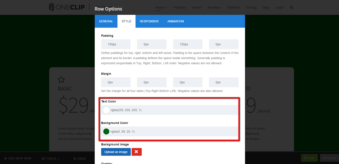 Now add a background color in the row option. Add a color that suits your pricing table focusing option.
