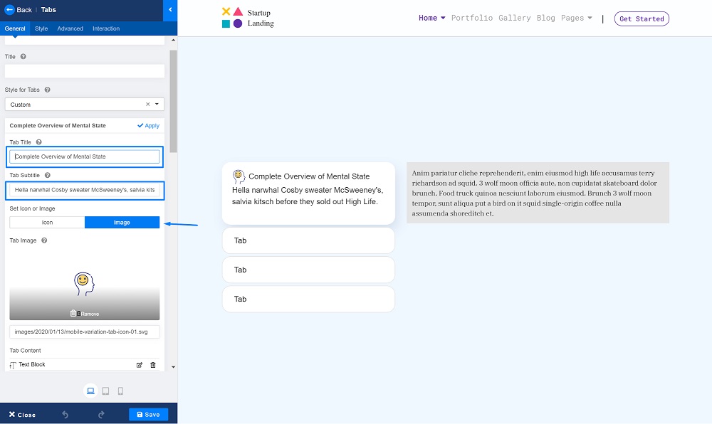 Once you have the basic structure going on, it’s time to add the content. Give your tab module a title and a subtitle simply by typing them in their respective field. You can also set an icon from the icon list or use a unique image as an icon as shown below.