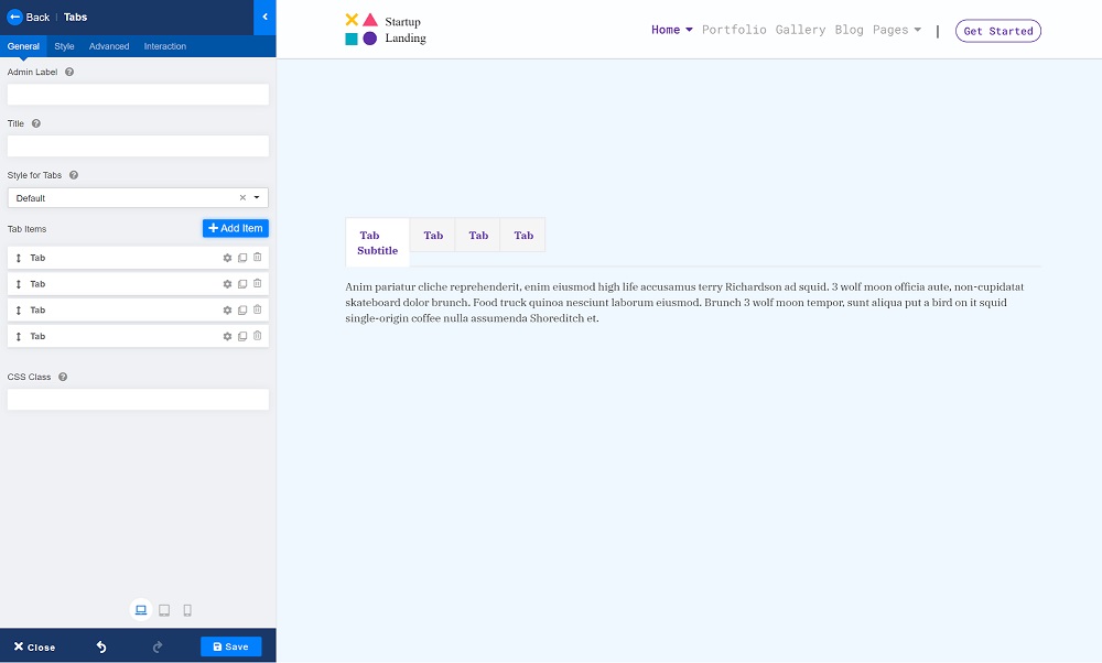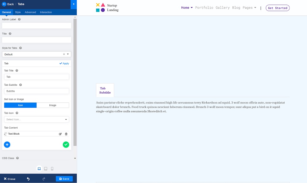 The Tabs add-on lets you choose your tab style to create beautiful responsive tabs with an easy intuitive interface. You have the option to choose from Modern, Default, Pills, Lines, and Custom. They all serve their purpose, but for this tutorial, let’s go with the Custom style.