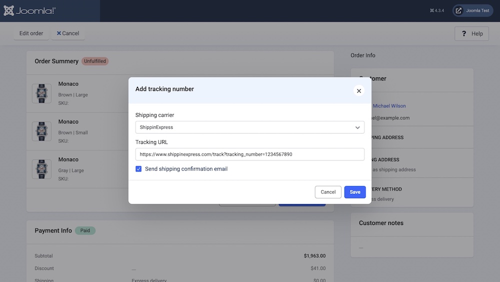 After an order has been placed, navigate to EasyStore > Orders within your Joomla dashboard. From here manually input the Shipping Carrier and Tracking URL and you can even send a shipping confirmation email to the customer with ease. Keep your customers in the loop and your business on the fast track to success!