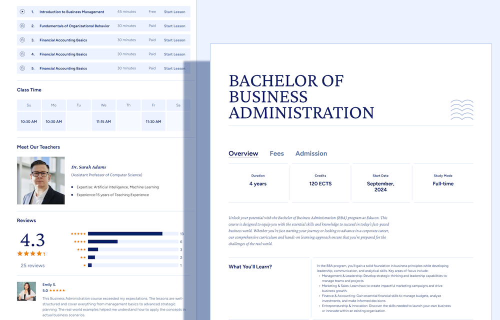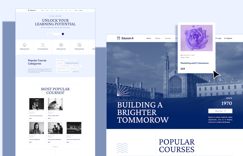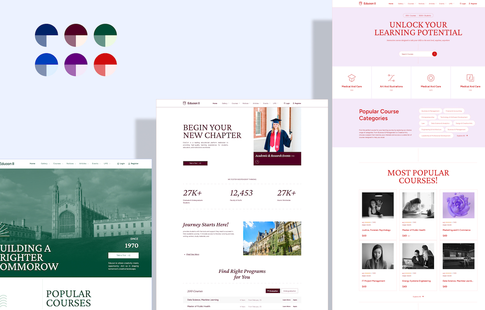 Educon II delivers unmatched flexibility, empowering both traditional academic institutions and online education platforms with a robust suite of features. The flexible design, color palette, and layout ensure it can meet the diverse needs of modern education.