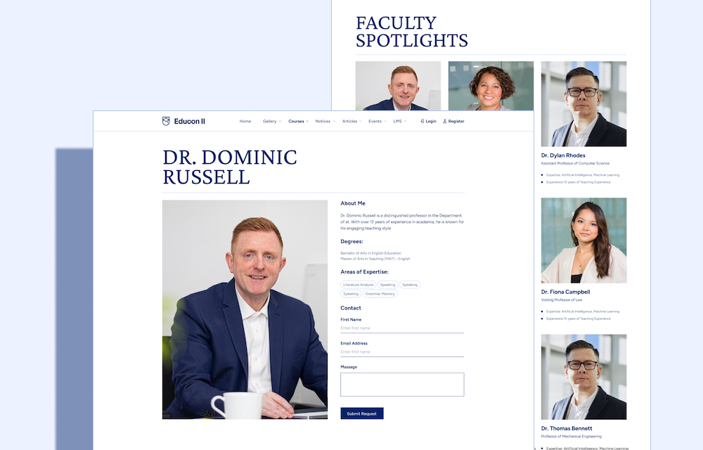 Faculty Profiles: Highlight your faculty members or guest speakers with detailed profiles showcasing their expertise and contributions.