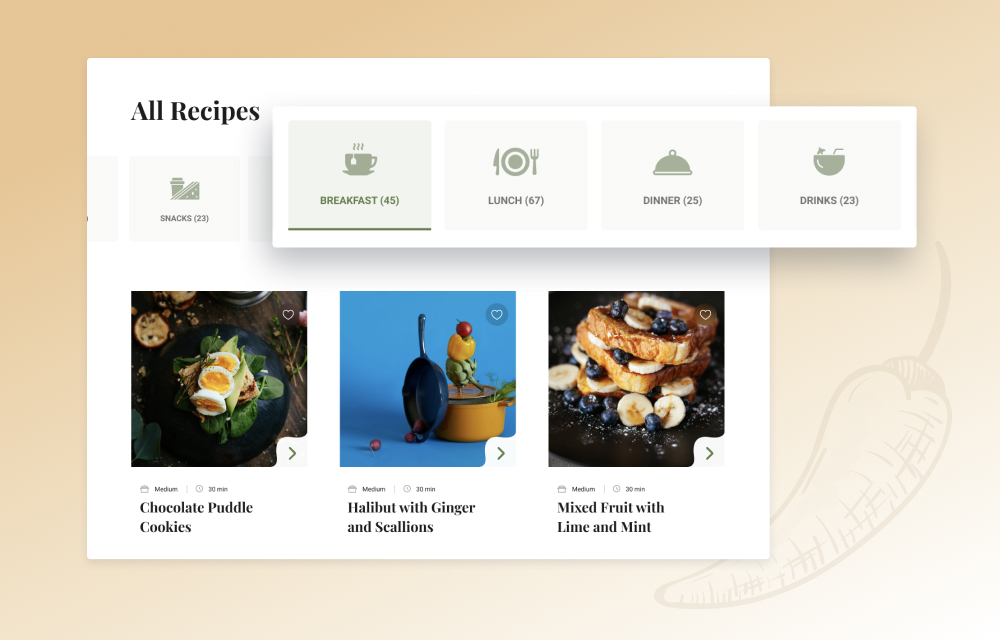 Get a well-organized recipe directory. You can list recipes in different categories for visitors to find their favorite recipes easily. Let visitors filter recipes by different categories, types, and more. Present listed items with rich images for a better impression. Have required time, difficulty level, and more with each item.