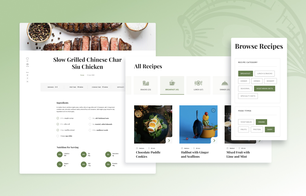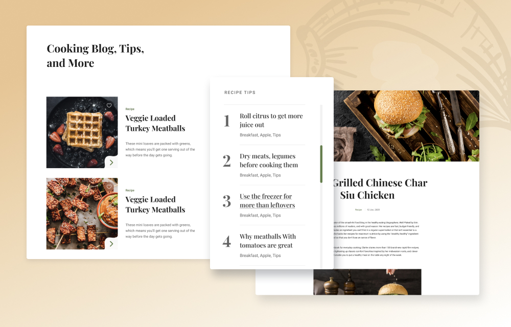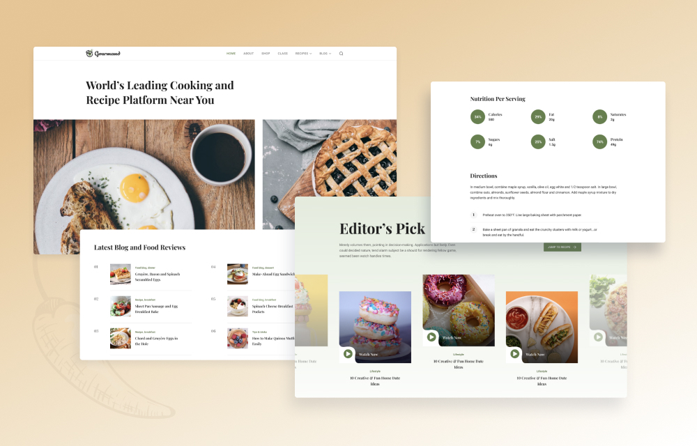 Gourmand gives you an elegant recipe detail page to showcase everything about the recipe. Have a rich hero section, detailed instruction, ingredients, and more to present with your food recipe. Include all ingredients of your recipe with the right amount and talk about the cooking process in easy steps.