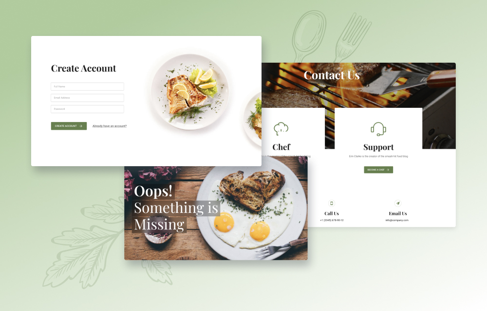 Contact: Let your visitors contact you on a nicely designed contact page. Visitors get different CTAs that they can use to generate leads or contact information on chefs and support staff.