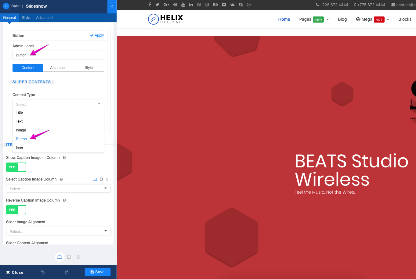 Adding a slider content title: Let's select Title from the drop-down list, put the title content (use a <br/> tag if you want a line break) in the box and define its type (h2) from the HTML Element list.