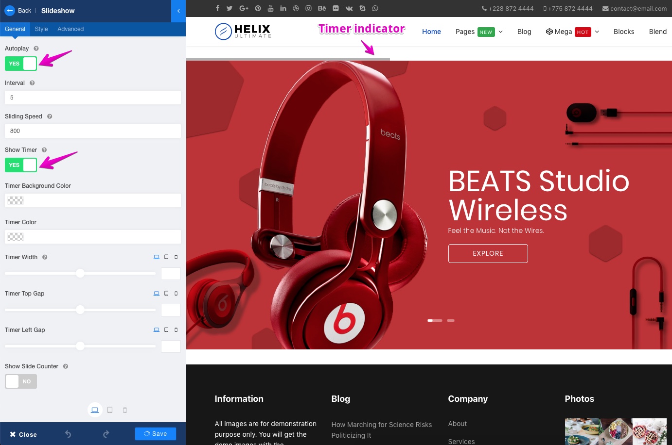 Setting the slider timer: You can show/hide the slider timer bar from the addonâs General settings tab.