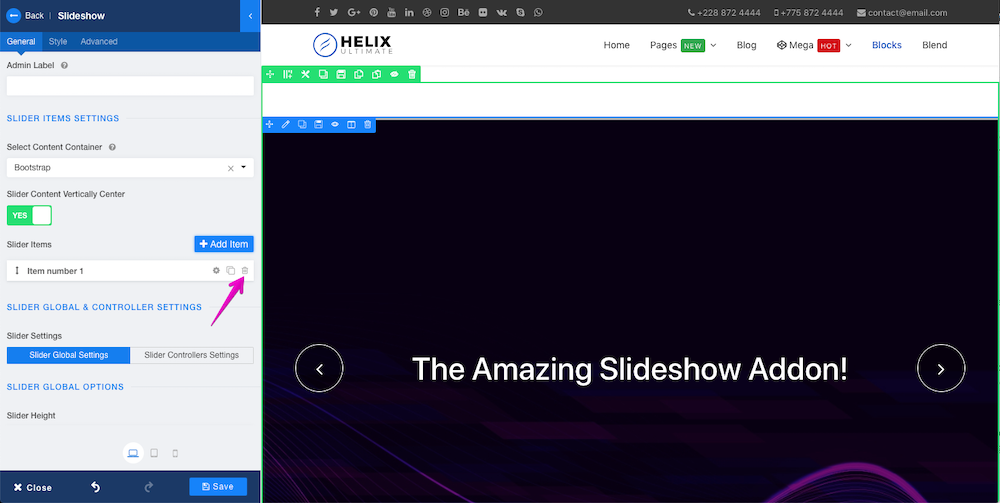 Upon placing the addon on the row, a demo slider frame will appear. We will delete that demo slider frame and then create our own ones.