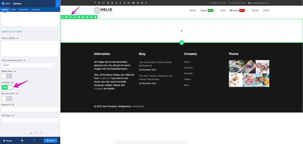 At first, we will open the Row Options and make it Fluid Row from the General section.