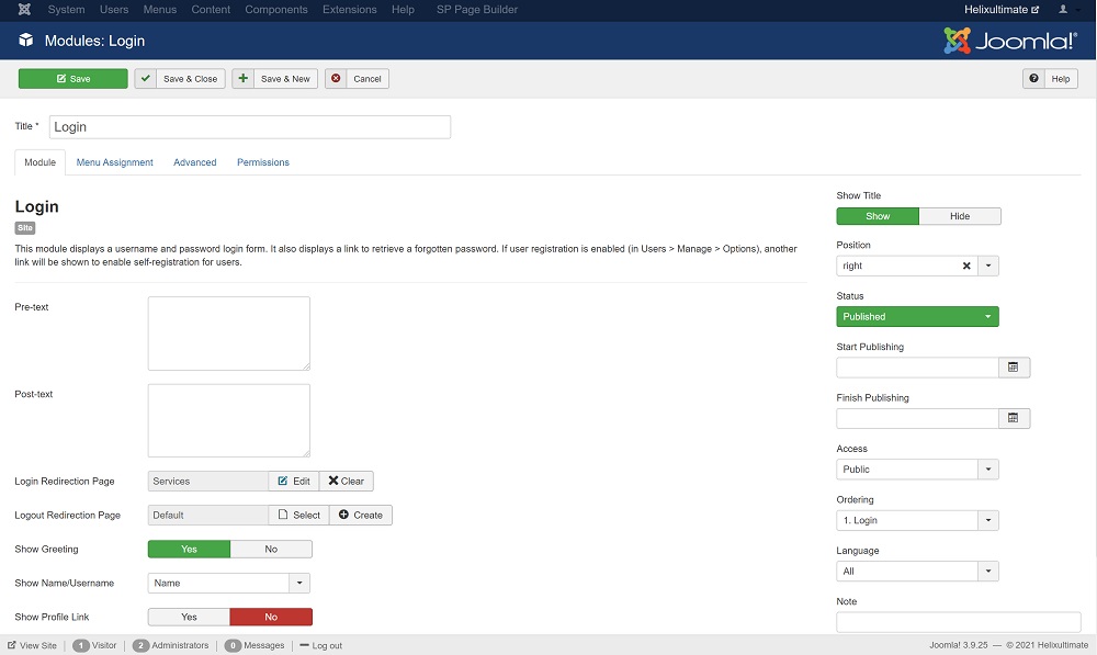Position: Select the position where you would like the Login module to show up on your site. We’ll set the position to the top right of the home page.