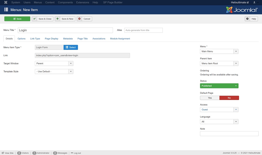 Hit Save & Close. Now the Login menu item will appear in your navigation if you are not logged in already. Once you’ve logged in, this will disappear as we have set the access level to Guest.
