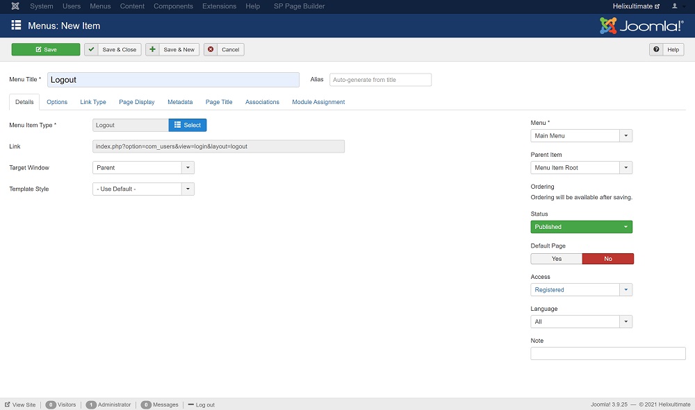 Hit Save & Close. Now the Logout menu item will appear in your navigation if you are logged in. This method is more preferable to method one as it is more intuitive and works better with any site design.