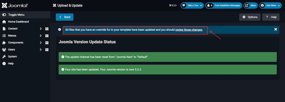 At this point, the update process will begin, and it should complete within a few seconds. Once the update is finished, verify the Joomla version number. Additionally, you’ll see a list of files that were overridden during the update, allowing you to review the changes.