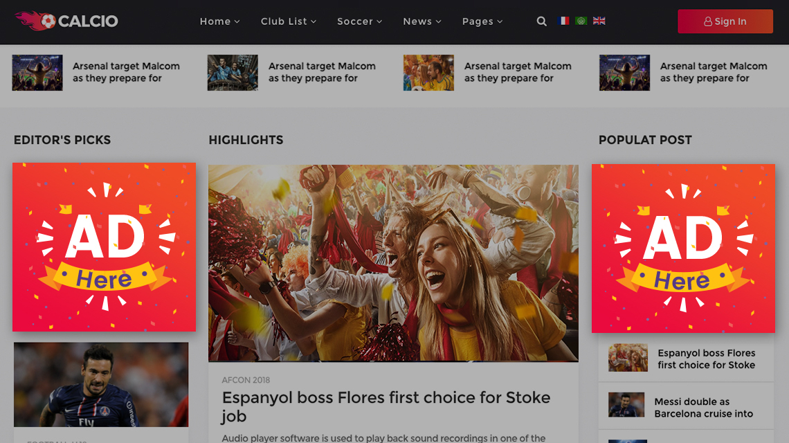 Get paid back for your hard work. With Calcio, you can monetize your contents by showing ads on the site easily. The template has several highly visible ad areas that are very conversion friendly.