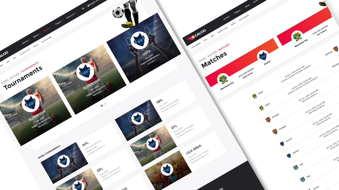 Calcio lets you add detailed information related to soccer tournaments and matches on your site. You can add and display an unlimited number of soccer tournaments, fixtures, group combinations, match results, timelines and so on utilizing the power of SP Soccer component given inside the template.