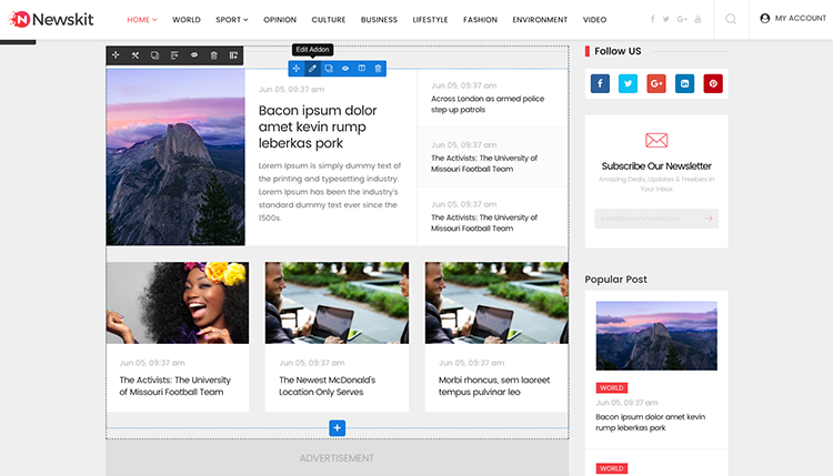 The entire design of NewsKit is powered by the revolutionary drag and drop live page composer tool SP Page Builder Pro. The crafty functional frontend editor brings an amazing experience of customizing and designing the total website on the front end. Do all the customizations and see the changes instantly. Its drag and drop functionality will let you have a flawless time and cost saving web building experience.