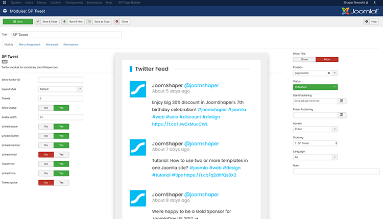 SP Tweet is a special module that comes along with the NewsKit template. The soul goal of the module is to give you a solid mechanism to add your Twitter feed right into your web pages. Display your Twitter feed anywhere on your news portal easily.