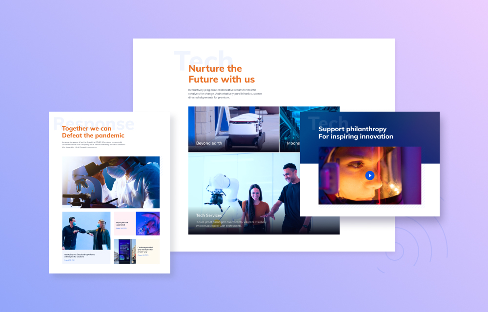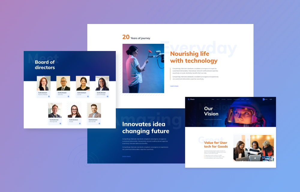 Easily present your company with a stunning hero section and features, and more. Get a well-designed home page layout for technology startups, medium and large-scale tech companies. Showcase product features and stats, testimonials, and more.