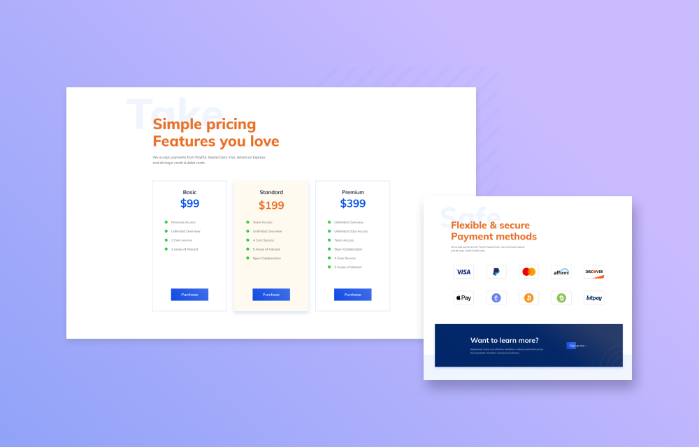 Need detailed pricing plans to offer applications in different packages? Pitech has a pricing table with multiple plans to get the job done. Get multiple pricing tiers and highlight your favorite one. Easily add multiple features and capabilities to each pricing. Also, showcase supported payment methods to make payment a breeze.