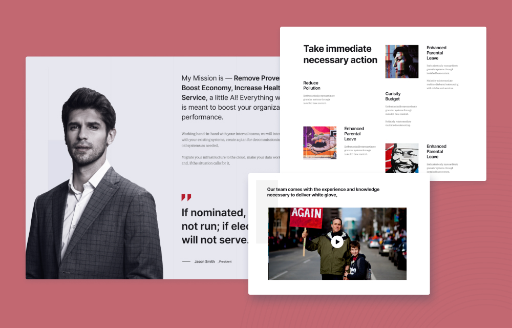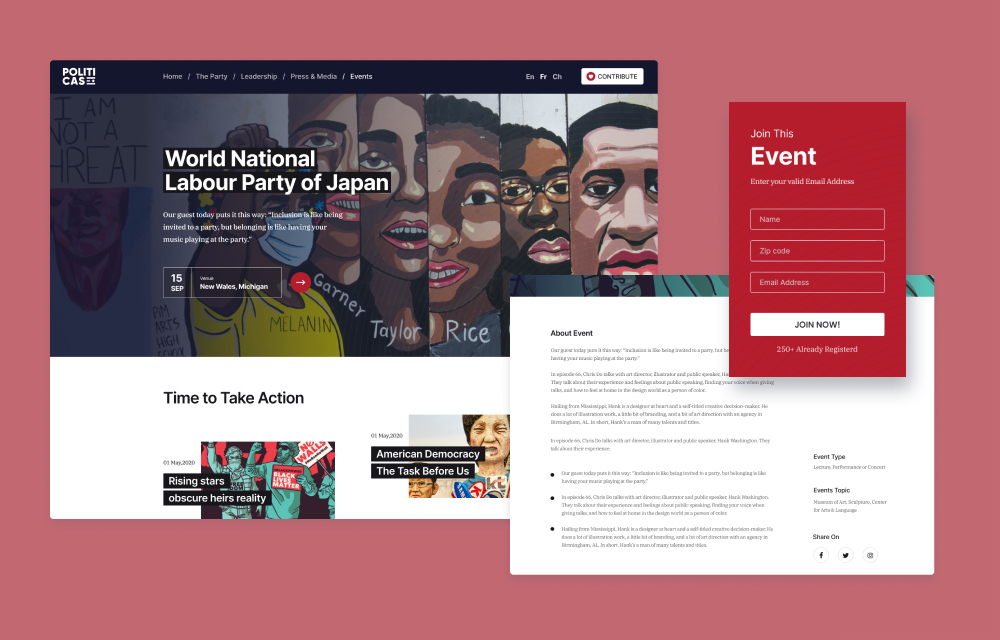 Websites can play an important role in presenting your party to your audience. Politicas brings two dedicated pages for your political party and politicians. Display party mission and vision, talk about ideology, and do much more.