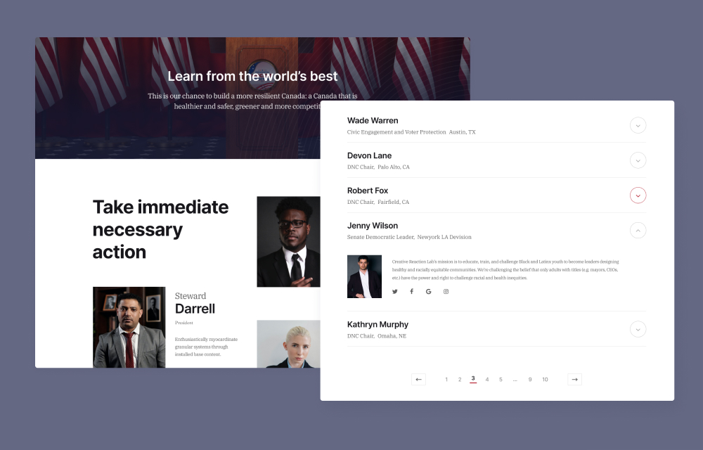 Political parties have leaders who run and execute political activities. List politicians and showcase them on the leadership page. Also, have a hero section and define your party leadership with words. Get a Party Leadership page and display politicians on your site with images and designations.