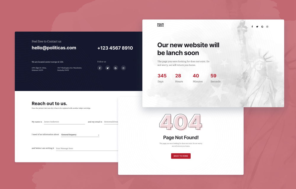 Get a bunch of built-in pages to launch a website for any political cause in the least possible time. You just have to change the demo content to get started. Get contact, coming soon, registration, and 404 pages to go with. It’s simple and easy.