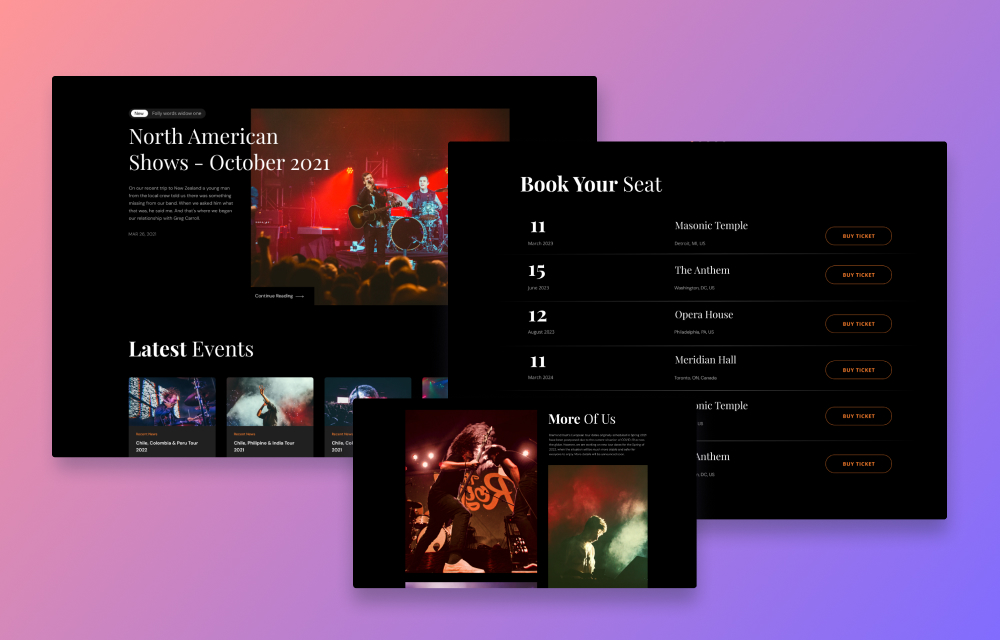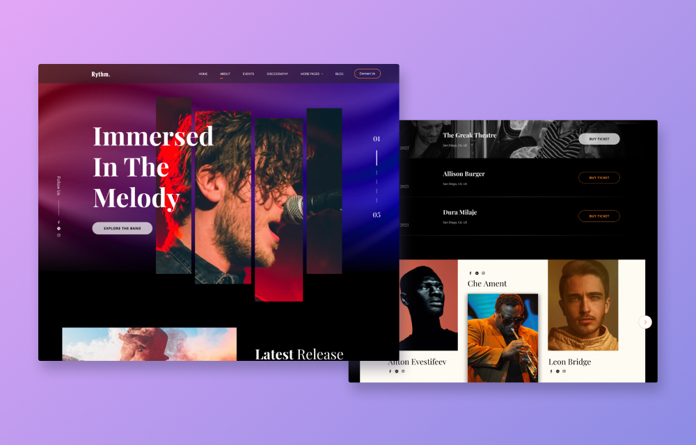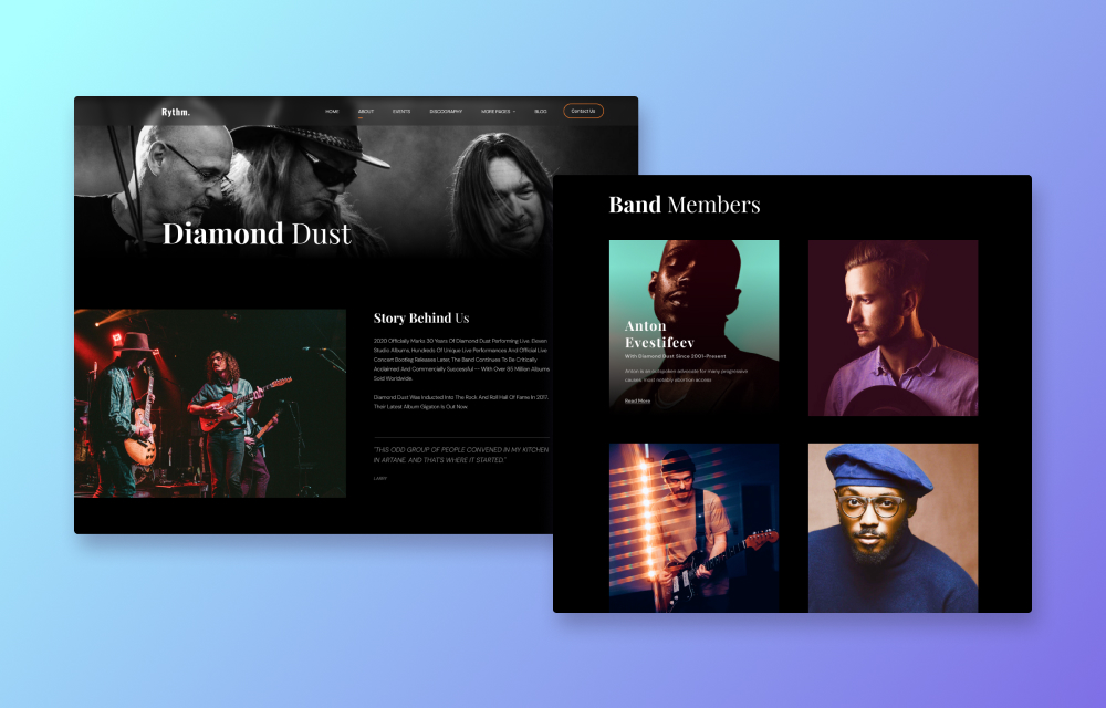 Present your music band to your fans and followers by telling behind stories, showcasing members, tours, and more on a wonderful about page. Tell who you are and impress fans with your rich background stories and musicians. List your recent tours and direct visitors to upcoming ones. Rythm lets you present your music bands with rich visuals attractively. Also, showcase details of every artist with attractive image thumbnails on the artist profile. Describe musicians, their roles, background stories, and more on their profiles. Include music, activism, social connectivity, and more. Showcase artists and talk about their specialties.