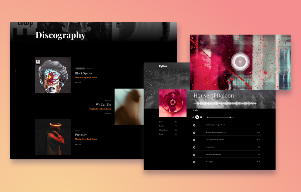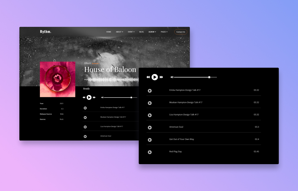 As a musician or music band, you will have music albums. Rythm lets you showcase those music albums and listen to songs online. List your albums in a timeline on a nice discography page. Appeal to music lovers with a sleek display of your music albums. Showcase each album with tracks easily with Advanced Audio Addon. Easily list albums with featured images, release date, genres, and other details.