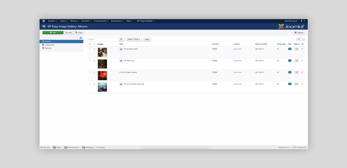 SP Easy Image Gallery is a Joomla extension for easily displaying stunning image galleries on your websites with necessary functionalities. Dedicated album creation, image adding and a whole lot other systems of SP Easy Image Gallery will give you a glitch free experience of beautiful image display. SP Easy Image Gallery serves you with lots of in-house options like customization of thumbnails, gutter and column management and many more exciting gears. Below are some of the main features packed in SP Easy Image Gallery.