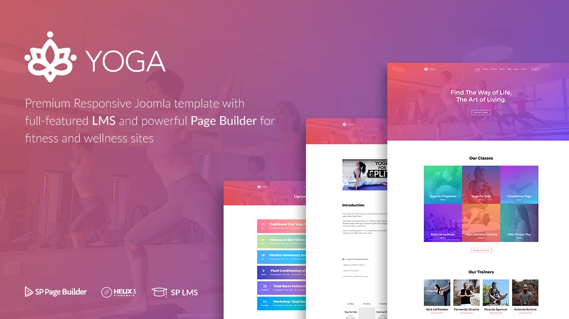 The Yoga template is powered by industry leading revolutionary visual Joomla page composer tool SP Page Builder and widely used templating framework Helix3. It has all the digital learning management features availed by our SP LMS component. We have introduced and added lots of new things to ensure all the features required to build a perfect fitness site. Also, there are two new dedicated addons, lots of modules and utility extensions with Yoga.