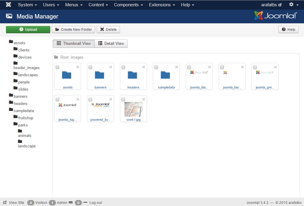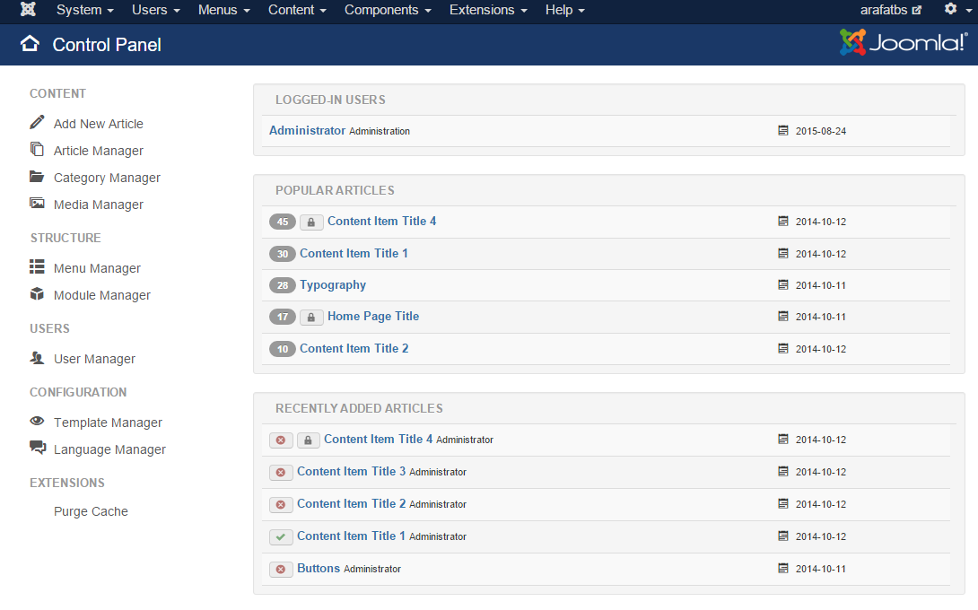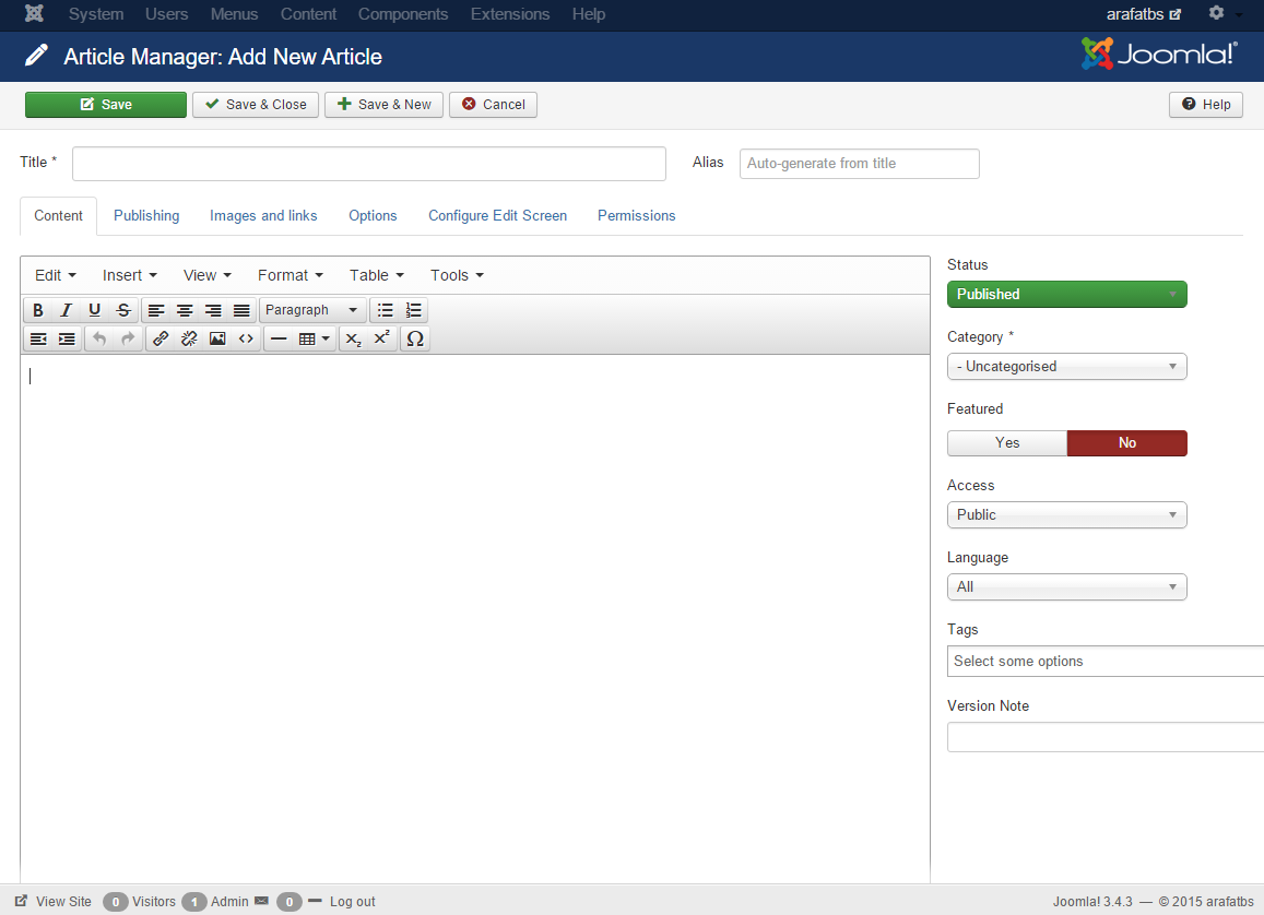 Click Add New Article (found in the Content menu) to add your first article on the Joomla.com site.