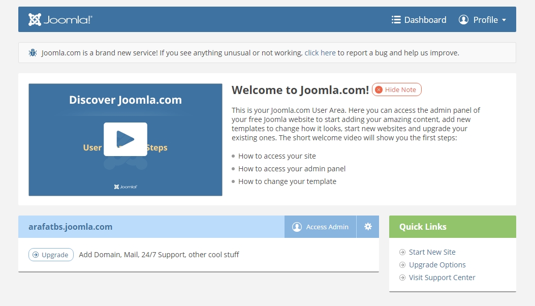 This is how the Joomla.com dashboard looks like.